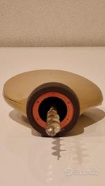 Il cavatappi Sieger 600 è un modello vintage, caratterizzato da un design compatto e robusto. Presenta una manopola ergonomica in bachelite o plastica dura di colore chiaro, con una forma bombata che offre una presa comoda durante l’uso. La parte inferiore è dotata di un meccanismo a vite in metallo, realizzato con acciaio resistente, mentre la base scanalata reca il marchio “Sieger 600”.