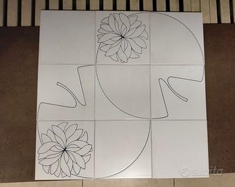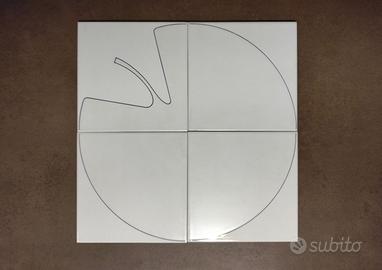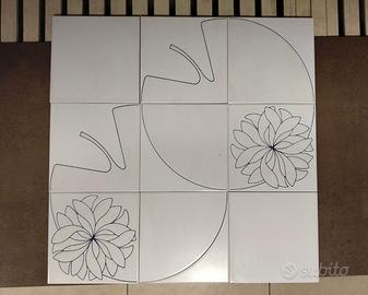 Cedit, decoro piastrelle "Ninfea"design Marco Zanuso,1974. Formato21,6x21,6x0,9cm La serie offre 2 particolarità: -la possibilità di comporre la Ninfea con o senza fiore,o intersecate tra loro (foto1-2-3-4) -La Ninfea è lucida solo esternamente, l'interno della Ninfea è opaco, caratteristica che offre massima visibilità anche con luce riflessa.(Foto5) Particolarità subito riconducibili alle serie Cedit firmate Zanuso. Composizione da catalogo originale Cedit(foto6) Disponibile anche fondo bianco Cedit abbinato su richiesta. Conservate perfettamente in scatole originali. Lotto decoro 4piastrelle con Ninfea,100€ (25€a piastrella)