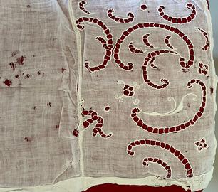 Centrino in lino ricamato a mano, con eleganti motivi traforati. È un pezzo artigianale d’epoca, ideale per chi ama lo stile vintage o cerca materiali per il cucito creativo.