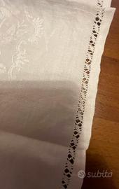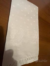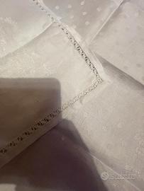 Centro tavola, bianco, con il bordo ricamato a mano, tessuto damascato e disegno visibili alla luce, quadrato, dimensioni cm 60x60, nessun difetto, eventualmente disponibili 2 pezzi (il prezzo è per uno), vero affare
