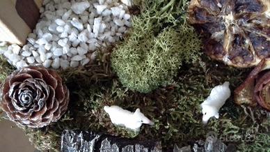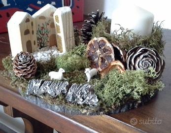 Centro tavola natalizio preparato appositamente per il prossimo Natale con materiale semplice, partendo da una base circolare ottenuta dal taglio di un tronco grezzo. Su questa base, del diametro di 20 centimetri sono sistemati i vari elementi come da foto: candela bianca, tre casette di legno tagliate e decorate, pigne, sassolini, arancia essiccata, muschi e due minuscole pecorelle. Il tutto viene spedito nella scatola di cartone rosso e fantasia come da foto. Farà sicuramente una bella figura su un tavolo, su una finestra o dove vuoi tu. Potrebbe essere anche un bellissimo regalo per chi apprezza oggetti artigianali da collezionare.
