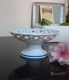 Centro tavola piccolino porta confetti e cioccolatini, porcellana Diamiani, nessun rottura ne difetti, foto mostrate con ingrandimento evidenziato, colore sul bianco e blu, perimetro rotondo circa 10x10/ cm./ altezza circa 4. 8/ mai utilizzato per quantità, ancora con scatola originale propia con lieve sciupo del suo tempo, a circa 40/ anni. nuovo ottimo stato di conservazione. possibilità di ritiro a mano, spese di spedizione da concordare, l'imballaggio sarà adattato e curato. 🤩