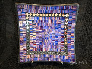 L'interno è un vero mosaico di riflessi: tessere vitree nei toni del blu profondo, del viola e dell'oro si fondono in una trama geometrica ipnotica, impreziosita da una cornice di specchietti romboidali che catturano la luce naturale della stanza. È un pezzo pensato per chi cerca un oggetto di design che sappia essere protagonista su una scrivania o un mobile d'ingresso, unendo l'utilità pratica a un'estetica ricercata.