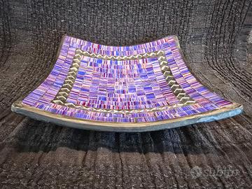 Per quanto riguarda lo stato conservativo, l'oggetto è stato curato con attenzione: due angoli sono stati riparati utilizzando della pasta di ceramica. Questo intervento, pur visibile a un occhio attento, non pregiudica minimamente la bellezza o la funzionalità del pezzo, ma anzi ne testimonia la storia e il recupero. È ideale sia come pezzo da collezione per gli amanti del mosaico, sia come elegante idea regalo.