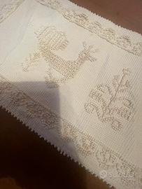 Centrotavola rettangolare o arazzo da parete con il tradizionale motivo delle pavoncelle della tradizione tessile sarda, lavorato con la tecnica pibiones. Misure cm 119 (senza frangie cm 77) x cm 30. Colore écru