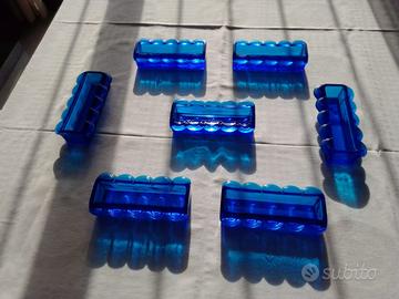 Raro centrotavola modulare in vetro grosso blu Art Decò, probabilmente di manifattura statunitense, di inizio 1900. Questo centrotavola è composto da 7 moduli, che possono essere utilizzati a piacere, come portafiori segnaposto, o composto al centro. La sua originalità e conservazione li rende straordinariamente interessanti, anche per l’eleganza e la nota di colore che portano ad una tavola elegante e ricercata.
