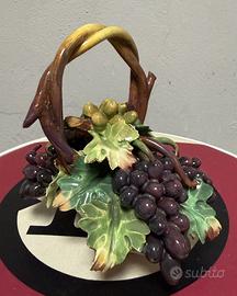 Centrotavola ceramica Capodimonte cesto con grappoli d'uva