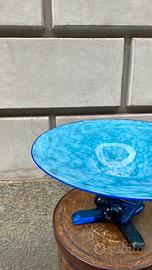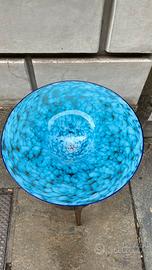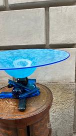 Grande coppa centrotavola Vetro soffiato colore acquamarina con decorazioni bianco latte, spessa base irregolare blu. Edizione Cleto Munari, 1991 Dimensioni: diametro 51 cm; altezza 26 cm; diametro base 20 cm