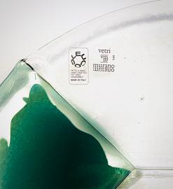 Questo esemplare si distingue per la sua forma circolare leggermente concava e per l’elegante composizione cromatica: la superficie, prevalentemente trasparente e lavorata a mano con finitura martellata, è arricchita da un settore in vetro colorato che crea un raffinato contrasto visivo. La lavorazione a mano, marchio di eccellenza della produzione muranese, conferisce al vetro un aspetto organico e materico, con spessori irregolari e leggere variazioni di texture che testimoniano l’unicità del pezzo. Sul retro sono presenti i marchi originali, garanzia di autenticità e provenienza. Questo piatto è ideale sia come elemento decorativo da esporre su tavoli o consolle, sia come centrotavola scultoreo capace di impreziosire qualsiasi ambiente. Un oggetto che unisce tradizione artigianale secolare e design contemporaneo, rendendolo un autentico pezzo da collezione.