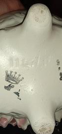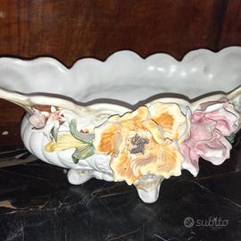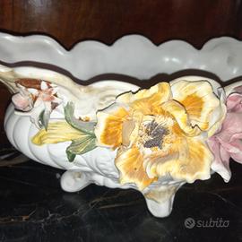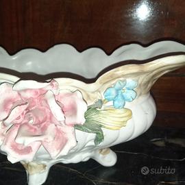 in fine porcellana, pregiata fattura artigianale Capodimonte motivo floreale solo su un lato che rappresenta rose e foglie eseguiti con cura nei dettagli e colori pastello. integra senza difetti il timbro certifica provenienza, qualità e ne aumenta il valore con il passare degli anni. da collezione