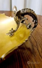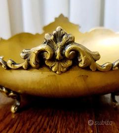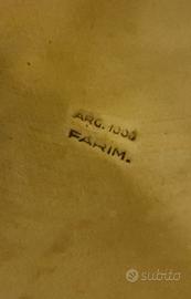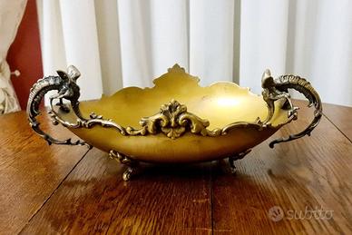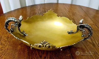 centrotavola o "fruttiera" a navetta in stile eclettico, caratterizzata da una vasca ovale sagomata, sostenuta da quattro piedini a voluta e impreziosita da anse zoomorfe. Il design richiama il gusto Neobarocco e il "Gusto Rinascimentale" tipici della produzione decorativa europea tra la fine del XIX e l'inizio del XX secolo." ARG. 1000": Questa dicitura indica che l'oggetto è in metallo argentato (spesso chiamato in gergo Silverplate o Argenteria Artistica) "FARIM.": Si tratta del marchio di fabbrica del produttore. La FARIM (Fabbrica Artistica Rappresentanze Industrie Metallurgiche) era una nota manifattura italiana, attiva principalmente nel XX secolo, specializzata nella produzione di oggettistica d'arte in metallo sbalzato e fuso con rifiniture in argento Anse Zoomorfe: L'elemento di maggior pregio sono le due impugnature modellate a forma di drago o creatura mitologica alata. Corpo e Bordura: La vasca presenta una profilatura mistilinea a "onda" con decorazioni applicate a foglie d'acanto e volute sui lati lunghi. La finitura interna mostra una lucentezza dorata/ottonata, tipica degli oggetti dove l'argentatura esterna è stata preservata mentre l'interno è stato trattato con una doratura galvanica (vermeil) o ha subito un'ossidazione differenziata del metallo base. Base: Poggia su quattro piedini fusi "en cabriole" decorati con motivi fogliacei, coerenti con il resto dell'apparato decorativo. Epoca stimata: Circa 1940 - 1960. Produzione: Italia (FARIM).peso 1054gr altezza 13cm lunghezza 37cm