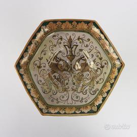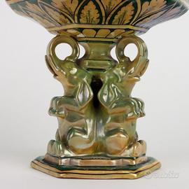 Centrotavola in maiolica a lustro nei toni del verde e dell'ocra. Su una base