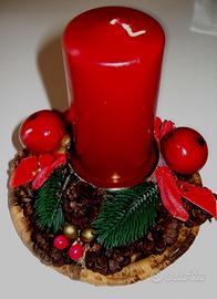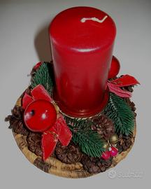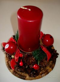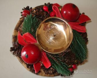 Famiglia privata vende come usato in perfette condizioni, un Centrotavola di Natale vintage, originale dei Primi Anni ’90, con candela rossa (quest’ultima nuova) e vere pigne naturali, assemblate ad altre decorazioni natalizie di altro vario genere di materiale, ancora in ottimo stato e ben conservato. Oltre alla grossa candela nuova, color rosso amaranto, sono stati sostituiti tutti i nastrini (tre fiocchi) di velluto rosso perché quelli originali erano imbrattati di vecchi residui di cera. Questo Centrotavola di Natale, è stato infine ben ripulito dalla vecchia cera secca, precedentemente colata, e poi anche accuratamente igienizzato a vapore, pronto per essere posto al centro di una tavola ben imbandita.