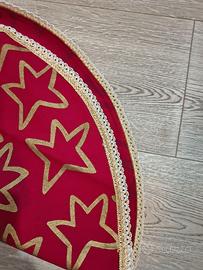 Centrotavola rotondo con un vivace sfondo rosso e un motivo di stelle dorate.