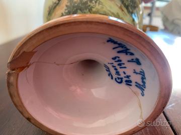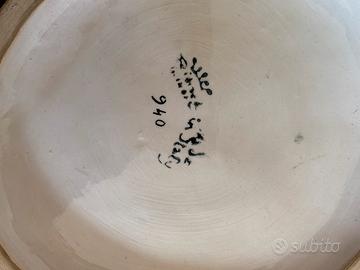 Centrotavola Richard Ginori Stile grottesco Interno blu Condizioni perfette Compisizione due uccellini, sempre Richard Ginori Anfora coi manici rotti, raffigurante la morte di Orfeo