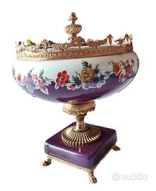 Elegante centrotavola vintage prodotto dalla ditta Alfa, Made in Italy, in raffinata ceramica bianca e viola con decorazioni floreali finemente dipinte.