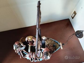 Lampara con pescatori, opera artigianale del Maestro calatino Mario Galesi, pezzo unico con certificato di autenticità allegato.