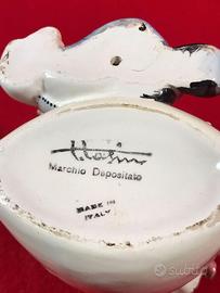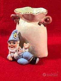 Vasetto porta penne in ceramica policroma, arricchito da simpatica figura in 3D di gnomo seduto ai piedi del vaso a forma di sacchetto. Vecchia produzione degli anni 50 made in Italy, Prodotto dall’artista ceramista Tarcisio Tosin in Vicenza, in buono stato di conservazione con piccoli segni del tempo, come da foto. Misure generali cm. 10x8x11,5.