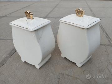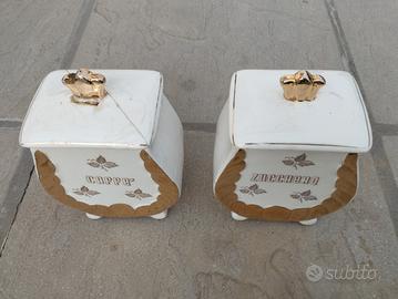 Vendo 2 contenitori in ceramica Capodimonte anni 50 circa bianco e oro, quello dello zucchero é integro mentre quello del caffé é danneggiato sia il coperchio che il contenitore, altezza 17cm, prezzo per la coppia 5€ ritiro a Gruaro. Non spedisco