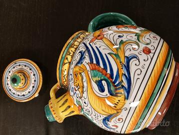 Teiera in ceramica Deruta decorata a mano con motivi Raffaelleschi. Altezza 12 cm e 18 cm di larghezza.