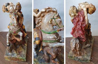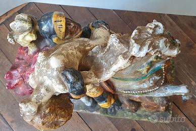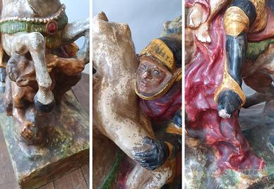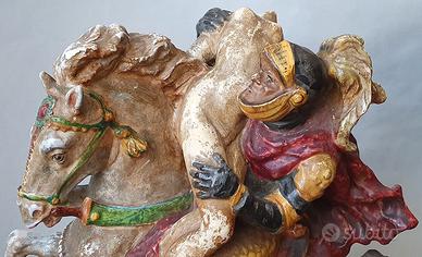 Elegante gruppo scultoreo in ceramica raffigurante un antico romano a cavallo durante il celebre episodio del Ratto delle Sabine. L'opera cattura il culmine della mitografia fondativa romana. La scena mostra il cavaliere al galoppo mentre travolge una figura sottostante (ispirata all'iconografia del fauno/natura selvaggia, elemento che eleva l’opera ad allegoria della Civitas), simbolo del trionfo della civiltà romana sul caotico istinto primordiale. La forza del soldato romano, fiero nella sua armatura, che solleva la giovane sabina in un abbraccio impetuoso, si contrappone plasticamente alla resistenza della donna rapita, creando una composizione carica di tensione emotiva e dinamismo. È il contrasto eterno tra la potenza del guerriero e la delicata eleganza della figura femminile. Il dinamismo del cavallo in posizione rampante ricorda le grandi interpretazioni pittoriche di maestri come Pietro da Cortona e Luca Giordano Opera di gusto barocco con influenze neoclassiche. La finitura policroma originale enfatizza il movimento dei drappeggi e la foga del destriero. Realizzata in ceramica smaltata, con una patina d’epoca che ne attesta l'autenticità e il fascino storico, la policromia, calda e segnata dal tempo, conferisce ai volti un’intensità umana rara. L’opera non è firmata e non porta marchi di fabbrica. L'oggetto, realizzato nella prima metà del novecento, si presenta in buone condizioni generali con i segni dell’età che ne accrescono il carattere (lievi cadute di colore o usura superficiale tipiche delle sculture antiche policrome), piccole lacune che non ledono la lettura formale dell’opera. La ceramica, mai restaurata, porta una spelatura sulla punta del piede sinistro del cavaliere. Le sue dimensioni sono: Altezza Cm. 53, Larghezza Cm. 45, Profondità Cm. 26. Il peso è di Kg. 13,5. Sono disponibili altre informazioni e fotografie. Data la fragilità dell’oggetto antico, che richiede un imballo sicuro e costoso, non si fa spedizione, ma solo ritiro di persona.
