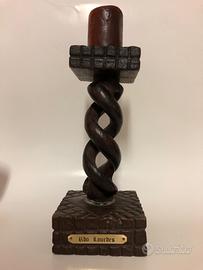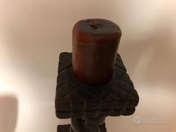 Cero votivo ricordo di Lourdes - mai acceso - con base in legno intagliato (altezza circa 25 cm) e piccolo portalume in vetro rosso con supporto in metallo lavorato, con figure religiose e pietre dure.