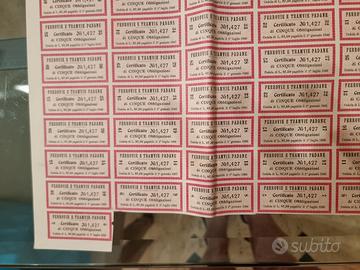 Raro certificato obbligazionario originale emesso da Ferrovie e Tramvie Padane (FTP) a Milano nel 1911, in buono stato di conservazione e completo del foglio originale delle 50 cedole e retro con piano di ammortamento dettagliato.