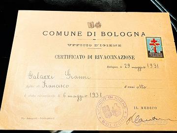Due certificati: vaccinazione (1926) e rivaccinazione (1931) Ufficio d'Igiene del Comune di Bologna. PNF, Mussolini, Duce, Fascismo, RSI.