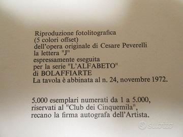 CESARE PEVERELLI Riproduzione fotolitografica su cartoncino di cm. 30x23,5, es. 2187/5000, espressamente eseguita per la serie "L'Alfabeto", di "BolaffiArte".
