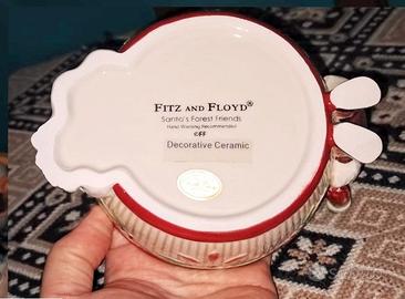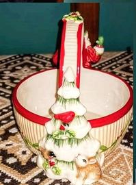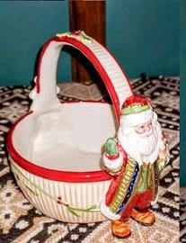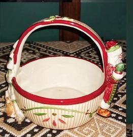 Cestello in porcellana decorata in tema natalizio Fitz and Floyd. Spesso utilizzato per servire caramelle, frutta o piccoli oggetti durante le festività natalizie. Fitz and Floyd è noto per le sue ceramiche decorate a mano e dai dettagli curati, che rendono questa ciotola un pezzo decorativo e funzionale.