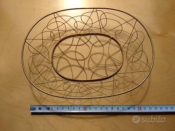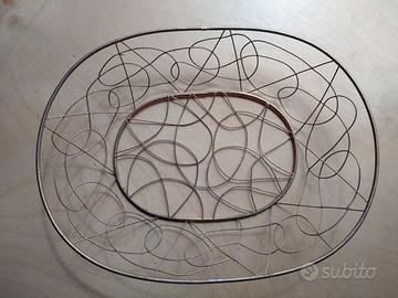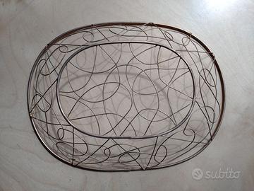 Cestino centrotavola in ferro dorato, con disegno originale fatto con un fil di ferro anch'esso dorato. Leggero e sobrio, dona quel tocco di eleganza ovunque venga posizionato. In ottime condizioni. Misure di riferimento in foto. Le foto descrivono esattamente il cestino e sono parte integrante della descrizione. Visita il mio profilo per altri oggetti per la casa e non solo.