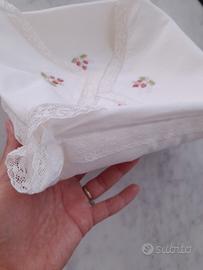 Delizioso e candido cestino portapane, è in stoffa e i quattro pannelli che proteggono chiudendo il cestino hanno sulla punta dei ricami fatti a mano.