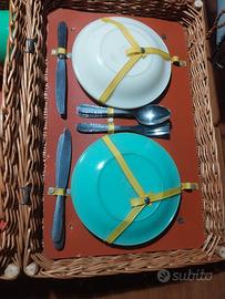 Cestino da pic nic in vimini originale anni 60. Completo di un set per 4 persone di posate e piatti fondi e piani, bicchieri e thermos più due contenitori e sale e pepe. Tutto il contenuto è originale ed in perfette condizioni. Vengono dati in più anche un porta uova e n. 6 piattini da frutta in plastica non inclusi nel set originale. Qualche piccolo segno del tempo e dell'uso. Dimensioni 50x35x20 cm.