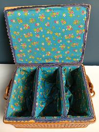 Cestino porta lana Vintage in paglia di Vienna. Rivestito all'interno e diviso