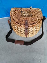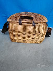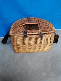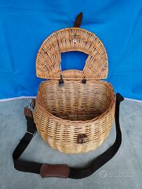 Vendo cesto in vimini con coperchio e tracolla regolabile. Il coperchio dispone di un foro di areazione e di una chiusura con cinturino.