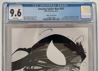 Come da titolo vendo il fumetto gradato in CGC di "The Amazing Spider-Man #692", "1980's" variant cover, in perfette condizioni, in cui sono presenti le origini e la prima apparizione di Alpha. Inoltre vi è l'apparizione dei Fantastici Quattro, Bestia e Iron-Man. La custodia che protegge il fumetto non presenta alcun segno di urti né tentativi di manomissione dell'articolo. Il fumetto è stato classificato come 9.6 e con pagine bianche.