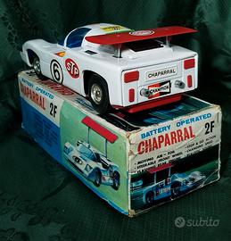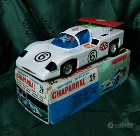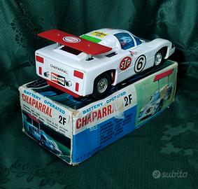 CHAPARRAL 2F A BATTERIA ALPS MADE IN JAPAN 1966 IN SCATOLA ORIGINALE FUNZIONANTE - VIDEO A DISPOSIZIONE SU RICHIESTA - SPEDIZIONE GRATIS IN TUTTA ITALIA - LEGGERE ATTENTAMENTE E CONTROLLARE L'INTERA GALLERIA FOTOGRAFICA - RARO MODELLINO IN SCALA APPROSSIMATIVA 1:16 (11 pollici - 28 cm) CHAPARRAL 2F A BATTERIA DELLA DITTA ALPS JAPAN DEL 1966 PRIMA DELL'AVVENTO DEI FILOGUIDATI - IN ECCELLENTI CONDIZIONI DI CONSERVAZIONE IN QUANTO SEMPRE MANTENUTO NELLA SUA SCATOLA ORIGINALE CON LEGGERI SEGNI DI STOCCAGGIO EVIDENZIATI IN GALLERIA FOTOGRAFICA - LA SCATOLA PRESENTA NORMALI ABRASIONI DEL TEMPO CHE NON NE COMPROMETTONO L'ESTETICA - MODELLINO CON SCOCCA IN METALLO E FINITURE IN PLASTICA COME IL FONDO - MOVIMENTO PERFETTAMENTE FUNZIONANTE TESTATO SENZA FARLE TOCCARE TERRA IN QUANTO MAI GIOCATA - PROFILO ALARE MOBILE, MOTORE POSTERIORE LAMPEGGIANTE, RUOTE ANTERIORI POSIZIONABILI PER UN MOVIMENTO CIRCOLARE - SLOT BATTERIE INTONSO - PULSANTE ON/OFF PERFETTO - INSERITA IN BUSTA DI PLASTICA PER PREVENIRE ULTERIORI ABRASIONI