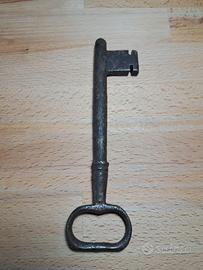Suggestiva chiave d’epoca in ferro pieno, probabilmente realizzata nella seconda metà del XIX secolo. La forma presenta un’impugnatura ovale con leggera curvatura ornamentale, stelo allungato con anello decorativo centrale e paletta dentata semplice ma robusta, adatta a una serratura di porta o armadio.