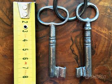 Vendo due chiavi antiche di fine '800, forgiate a mano, con anello di raccordo. Lunghezze: circa 8 cm. Prezzo complessivo non trattabile 25 euro.