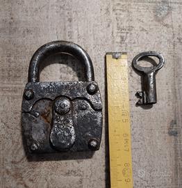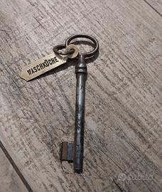 Vendo lotto di lucchetto e chiavi antiche di cui due femmina dell' inizio 900 provenienti da castello austriaco. Chiave con targhetta in ottone con inciso waschküche (lavanderia). Lucchetto funzionante con copri toppa a molla. Non vendo singolarmente.