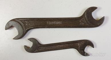 N.2 vecchie chiavi inglesi, la più grande riporta doppia scala in mm. e inc. (16/17-3/8 e 5/16), l'altra solo in mm. (11/12). Nota: sono presenti segni di ossidazione