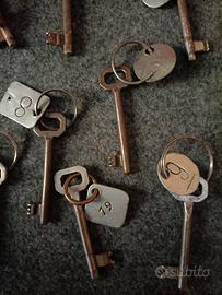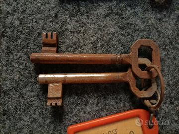vendo enorme lotto di chiavi dagli anni 40 agli anni 80, tutto materiale unico, la maggior parte con profilo fs, più di cento pezzi, altre da interni vecchio stile, vecchie chiavi da camere dormitorio, targhette portachiavi talvolta di alluminio con incisioni manuali di numeri e descrizione. oggetto di interesse collezionistico e storico seppur economico. a chi acquista il blocco posso fornire informazioni più precise e foto anche a mezzo whatsapp. non le ho contate tutte ma sono tutte visibili nelle foto.