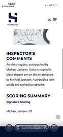 memorabilia Micheal Jackson firma chitarra elettrica. Chitarra elettrica 3rd Ave Perfetta in ogni sua parte, si presenta in eccellenti condizioni così come nelle foto. Chitarra elettrica 3rd Avenue, modello stile Stratocaster, autografata da Michael Jackson con pennarello nero Sharpie sul battipenna bianco. La firma è ampia, ben posizionata e perfettamente leggibile, ideale per esposizione. L’autenticità della firma è garantita da Holland Shier Authentication, con certificato digitale e fisico, contenente: •Numero di certificazione: 0000090942 •Ologramma applicato sul retro del battipenna •QR Code verificabile online sul database ufficiale •Data di autenticazione: 16/09/2025 La chitarra è in ottime condizioni estetiche, completa di tutte le parti originali. Il modello, pur essendo di fascia economica, rappresenta una base perfetta per un pezzo da collezione: il valore è infatti determinato dalla firma dell’artista e dalla sua autenticazione. Oggetto ideale per collezionisti di memorabilia musicali, fan di Michael Jackson o per esposizione in studi, locali o ambienti tematici. Condizioni •Stato generale: Ottimo •Firma: perfetta, senza sbavature •Corpo e battipenna: minimi segni superficiali compatibili con la normale conservazione •Completamente originale Documentazione inclusa •Certificato digitale Holland Shier Authentication •Ologramma numerato applicato sullo strumento Spedizione L’oggetto verrà spedito in 24h con imballaggio protettivo rinforzato per garantire massima sicurezza durante il trasporto oppure consegnato a mano.