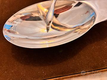 Iconica salsiera della Maison Christofle disegnata dal designer Fjerdingstad che rappresenta un cucchiaio a forma di cigno e corpo a forma di contenitore.
