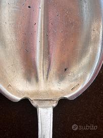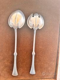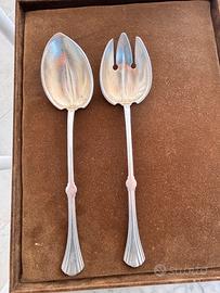 2 posate per insalata della linea Lotus della Christofle. il disegno rivela lo stile Liberty dell’epoca in quanto risalgono ai primi del ‘900. visibilmente usate hanno piu di in secolo, possono ancora essere presentate e usate. ci sono dei graffi e delle disargentature con usura sul retro. vedi foto. argento placcato e vermeil ormai scolorito. misura 27 cm.