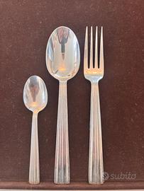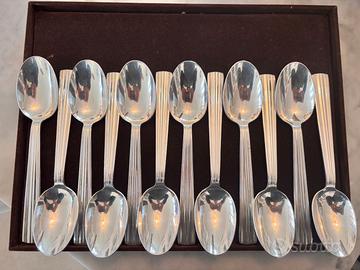 Negli anni '30 Luc Lanel ha disegnato per la Maison Christofle tante linee che esaltavano il periodo di art deco e fra le sue più conosciute certamente America e Boreal. Questo modello prende il nome di Mira o Ondulation, disegnato nel 1928 e prodotto anche in comunione con la Maison Alphenide della quale è presente il punzone insieme a quello Christofle. Le foto ammesse sono solo 6 ma su richiesta posso inviarne altre. Il servizio è in condizioni fantastiche visti i quasi 100 anni, viene nel suo astuccio (non originale) e comprende 1 Mestolo, 12 Cucchiai da Zuppa, 11 Forchette da Tavola e 11 Cucchiaini da the/caffè,(sfortunamente le due posate sono mancanti). I coltelli non si regalavano in quegli anni alle coppie che si sposavano in quanto non considerati di buon augurio... scaramanzia!! ecco la ragione per cui tante valigette non li hanno a corredo. Il prezzo tiene presente delle mancanze. No perditempo.