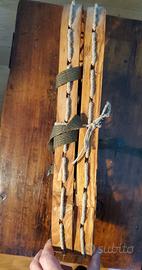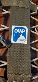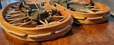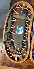 Fantastiche racchette da neve - ciaspole Camp in legno, spago e tessuto. Perfette in ogni dettaglio, legno, nodi dello spago, tessuto e parti metalliche delle fettucce, mai nemmeno sballate.