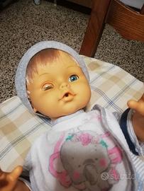 grazioso cicciobello della ditta migliorati marchiato su collo e schiena,vestitino aggiunto.modello in plastica dura,sessuato.se ci si dà da bere fa pipì,ma il meccanismo del pianto non funziona più.vitina del vano batterie adattata perchè persa.capelli saldi.un occhio è bloccato e rimane sempre aperto.plastica senza rotture o macchie.viso dolcissimo.
