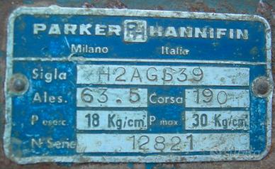 Cilindro pneumatico a doppio effetto Parker Hannifin. Diametro esterno mm 69.5, diametro stelo mm 25.5, alesaggio 63.5, corsa mm 190, pressione di esercizio kg/cm2 18, pressione massima kg/cm2 30. Fori per attacco tubi M14 x 1.5. Foro collegamento stelo M20 x 1.5. Base mm 118 x 706 con 4 fori diametro mm 9. Lunghezza massima cm 39.5. Peso kg 6.100. Vendo a 90 euro. Tel. 389/4248546 o 085/8207262