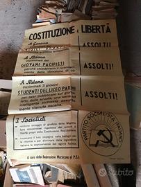 Vari oggetti di propaganda politica, spille, manifesti, riviste e due striscioni